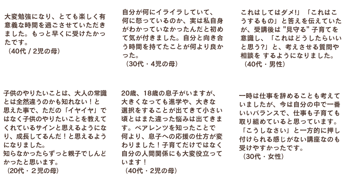 子育ての正解・不正解をお伝えする講座ではなく、根本的な "子どもの心に届く言葉を、自然と発することが出来る状態" から学んでいく講座です。